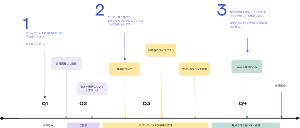 - サロンのビジネス戦略の作成(Q3): ウェブサイトだけでなく、ビジネス全体の成長を見据えた戦略を一緒に作り上げます。